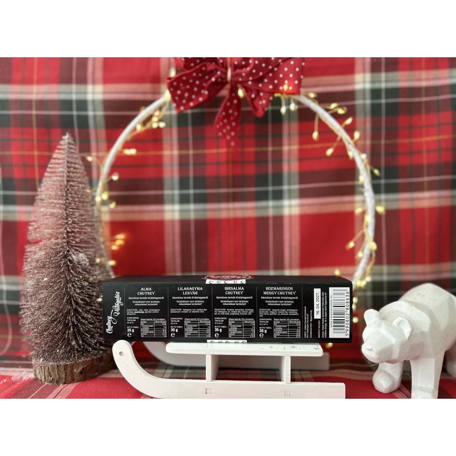 | Összetevők | Gyömbéres alma, balzsamos lilahagymalekvár, elegáns birs és fűszeres meggy chutney |